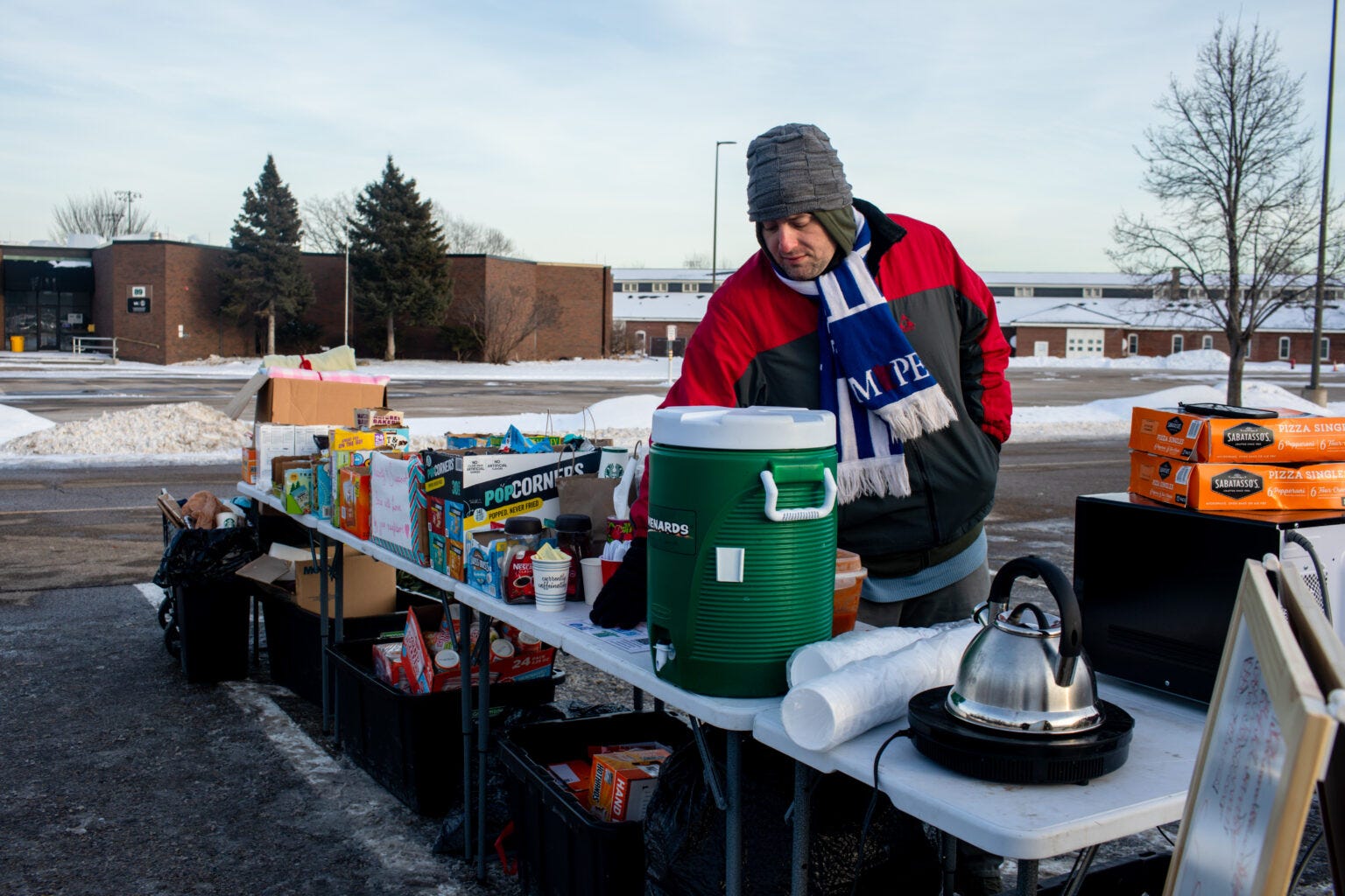 Mutual Aid Supplies: Tables are staged with food, water, coats, and essentials for immediate distribution.