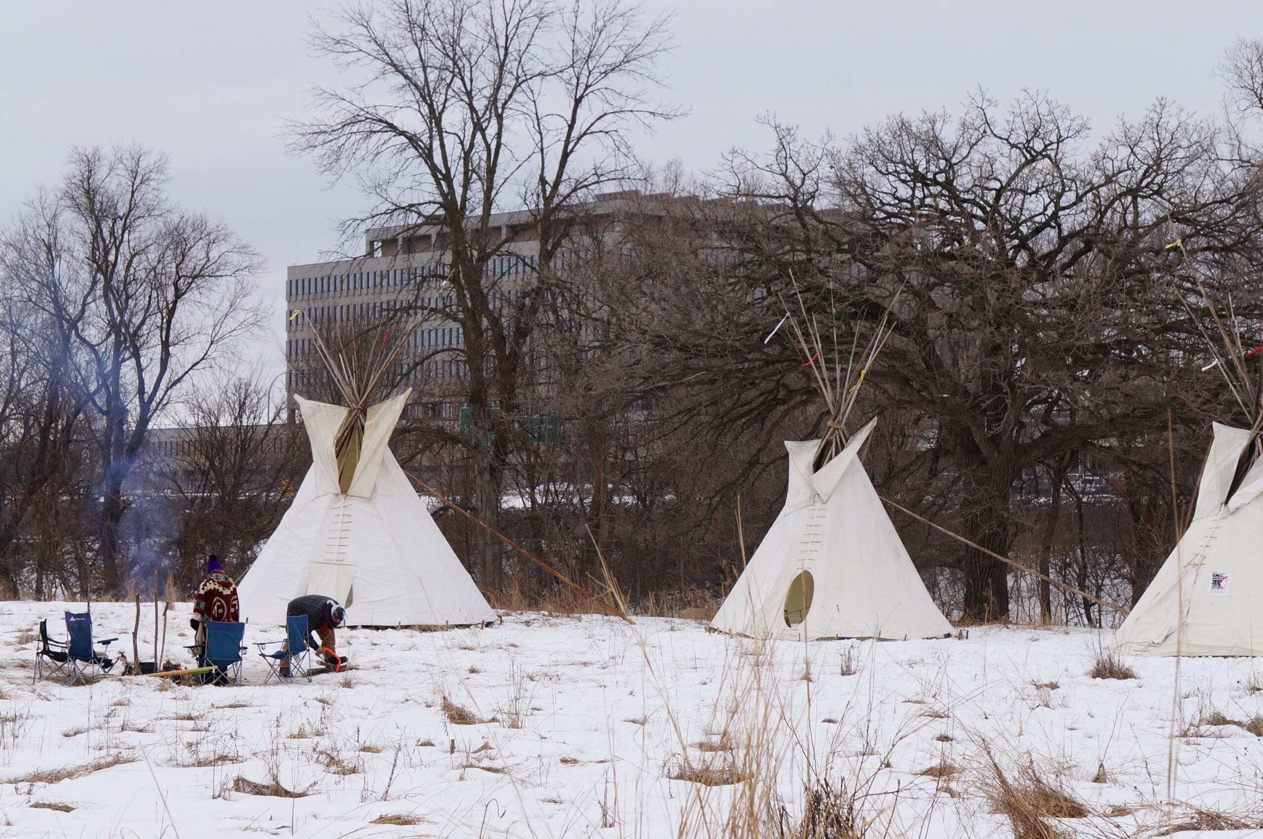 Prayer camp and vigil presence near the building — community holding space in the snow against the detention facility.